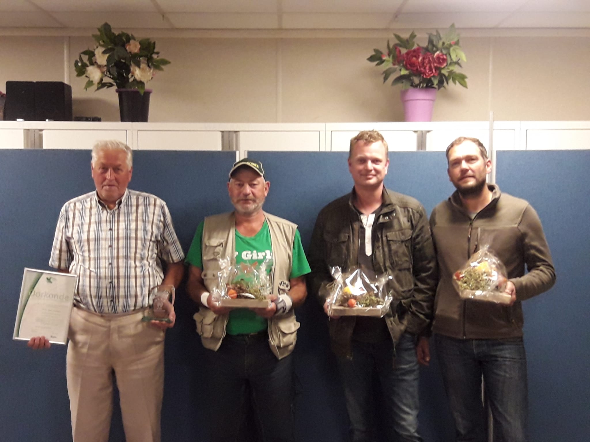 NIEUW-LEKKERLAND • Vorige week zijn tijdens de jaarvergadering van kleindierensportvereniging N.K.P.V Nieuw-Lekkerland enkele trouwe leden in het zonnetje gezet. Op de foto staan v.l.n.r. P.C den Ouden voor 50 lid van de KLN (kleindierliefhebbers NL) en de N.K.P.V., Leen Groenendijk (nam na 34 jaar afscheid van zijn bestuursfunctie), Stefan de Jager (nam na 9 jaar afscheid van zijn bestuursfunctie) en Arjen den Ouden (nam na 18 jaar afscheid van zijn bestuursfunctie).