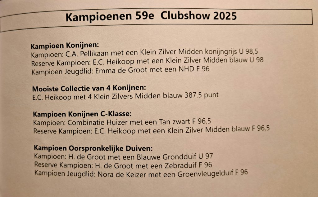 Kampioen konijnen U 98,5 Eigenaar: C.A. PellikaanReserve kampioen U 98.0 Eigenaar: E.C. HeikoopKampioen Oorspronkelijke duiven U97 Eigenaar: H. De Groot